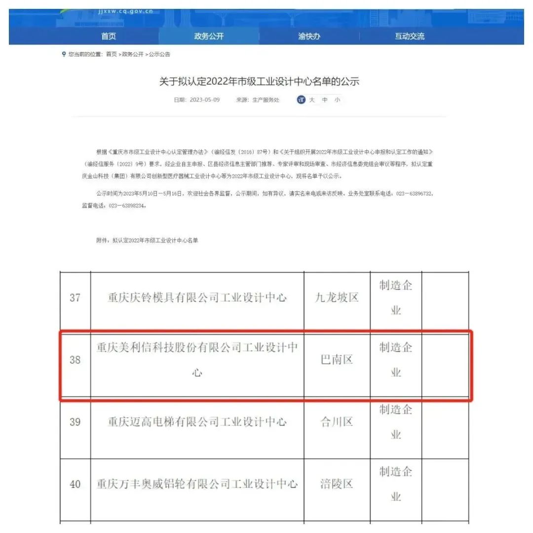 5月9日,重庆市经济和信息化委员会公布拟认定2022年市级工业设计中心名单,美利信科技成功入选。