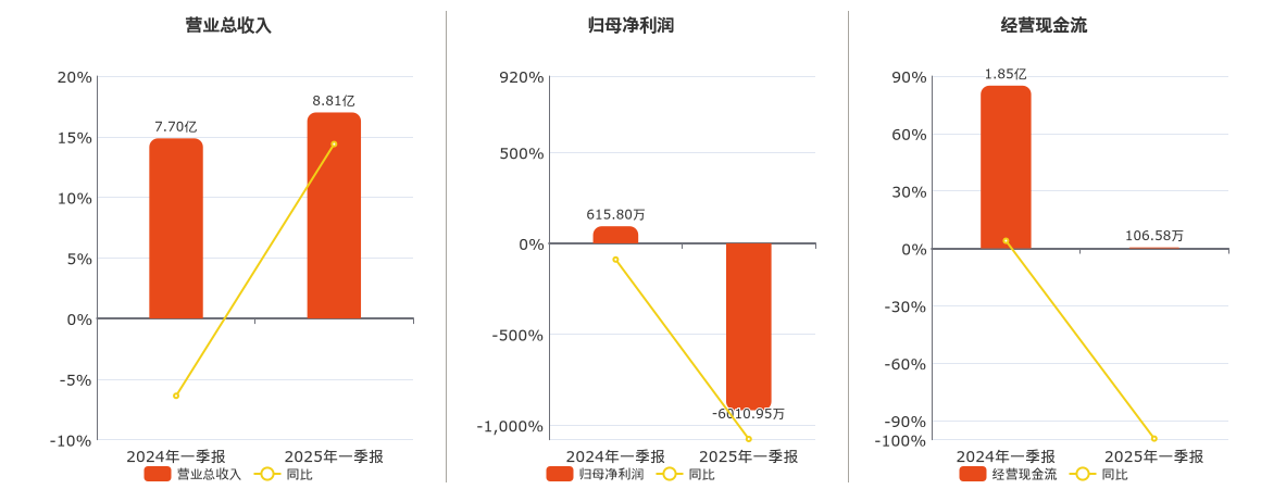 公司营业总收入为8.81亿元。归母净利润为-6010.95万元,较去年同报告期归母净利润减少6626.76万元,同比较去年同期下降1076.12%。经营活动现金净流入为106.58万元,较去年同报告期经营活动现金净流入减少1.84亿元,同比较去年同期下降99.43%。