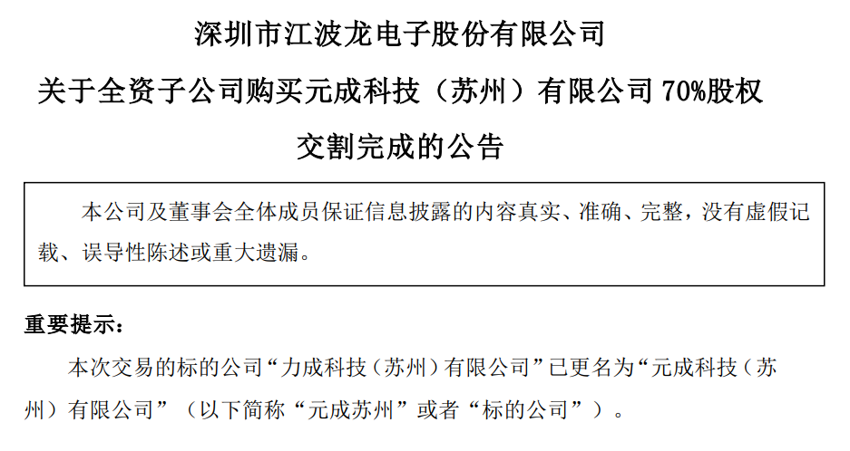 10月9日晚间,江波龙电子发布公告称,本次交易的标的公司“力成科技(苏州)有限公司”已更名为“元成科技(苏州)有限公司”(以下简称“元成苏州”或者“标的公司”)。江波龙与力成科技70%股权收购正式交割完成。