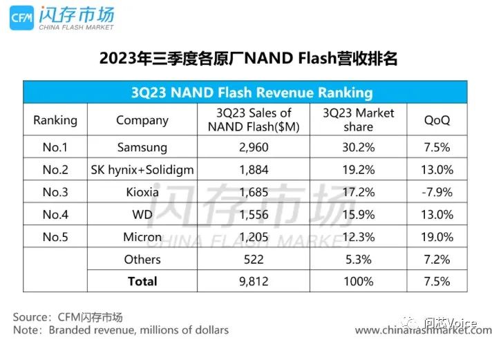 针对全球存储市场排名现况,CFM闪存市场数据显示,2023年三季度全球NAND Flash市场规模环比7.5%至98.12亿美元。三季度NAND Flash整体平均价格环比增长,除了Kioxia因NAND Flash在7~9月出货量下降影响NAND销售收入环比下滑外,其他原厂均在三季度实现NAND Flash收入的环比增长。
