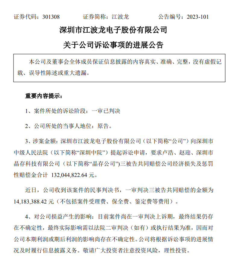 近日,深圳市江波龙电子股份有限公司(以下简称“江波龙”)发布公告称,公司收到了深圳中院出具的(2020)粤03民初3333号《民事判决书》的一审判决。根据判决,被告卢浩、赵迎、深圳市晶存科技有限公司(以下简称“晶存”)于本判决生效之日起十日内连带赔偿原告深圳市江波龙电子股份有限公司经济损失 14,183,388.42元。