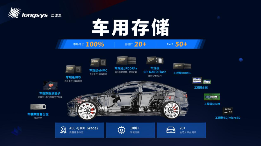 现如今,江波龙已经构建起涵盖eMMC、UFS、LPDDR、SLC NAND Flash的车规级存储矩阵,覆盖Flash和DRAM两大存储类型,从大容量存储到小容量存储均有布局,并且拓展了车载数据备份盘、车载SSD/DIMM、车载存储卡等综合的车用存储产品,广泛应用于ADAS高级辅助驾驶系统、智能座舱等10余种车载应用。