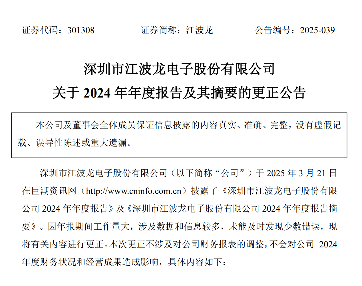 5月30日晚,江波龙(301308)披露了2024年年度报告及其摘要的更正公告。公告称,因年报期间工作量大,涉及数据和信息较多,未能及时发现少数错误。