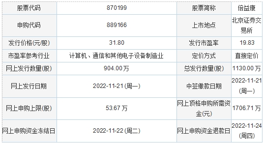 倍益康2022年11月16日披露的向不特定合格投资者公开发行股票并在北京证券交易所上市发行公告显示,若本次发行成功,超额配售选择权行使前,预计公司募集资金总额35,934.0000万元,扣除预计发行费用3,169.9180万元(不含增值税)后,预计募集资金净额32,764.0820万元。若超额配售选择权全额行使,预计公司募集资金总额为41,324.1000万元,扣除预计发行费用3,523.8500万元(不含增值税),预计募集资金净额为37,800.2500万元。