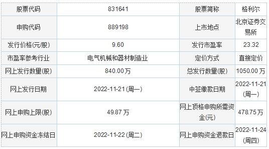 格利尔2022年11月16日披露的向不特定合格投资者公开发行股票并在北京证券交易所上市发行公告显示,若本次发行成功,超额配售选择权行使前,预计公司募集资金总额为10,080.00万元,扣除发行费用1,373.58万元(不含增值税)后,预计募集资金净额为8,706.42万元;若超额配售选择权全额行使,预计公司募集资金总额为11,592.00万元,扣除发行费用1,373.58万元(不含增值税),预计募集资金净额为10,218.42万元。