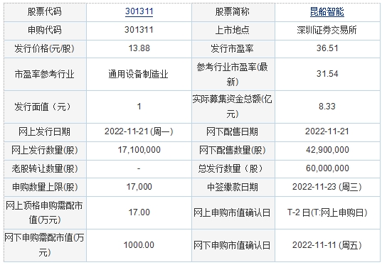 昆船智能2022年11月18日披露的招股书显示,根据初步询价结果,经公司和保荐机构(主承销商)协商确定,本次发行新股6,000.00万股,本次发行不设老股转让。按本次发行价格13.88元/股,公司预计募集资金83,280.00万元,扣除预计发行费用约5,623.74万元(不含增值税)后,预计募集资金净额约为77,656.26万元,如存在尾数差异,为四舍五入造成。