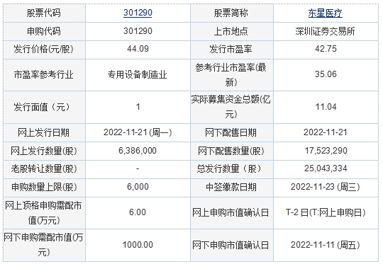 东星医疗2022年11月18日披露的首次公开发行股票并在创业板上市发行公告显示,根据初步询价结果,经公司和主承销商协商确定,本次公开发行新股2,504.3334万股,本次发行全部为新股,不安排老股转让。按本次发行价格44.09元/股计算,公司预计募集资金总额为110,416.06万元,扣除发行费用10,158.79万元(不含增值税,含印花税)后,预计募集资金净额约为100,257.27万元。