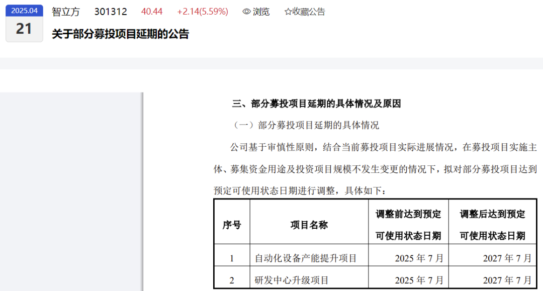 2025年4月21日,公司发布《关于部分募投项目延期的公告》。公告称:公司基于审慎性原则,结合当前募投项目实际进展情况,在募投项目实施主体、募集资金用途及投资项目规模不发生变更的情况下,拟对部分募投项目达到预定可使用状态日期进行调整。两个项目调整前达到预定可使用状态日期为2025年7月,调整后延期到2027年7月,延期了整整2年。