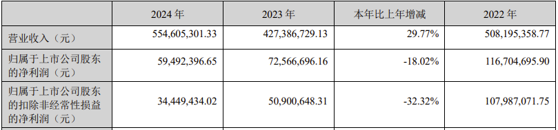 遗憾的是,上市当年营业收入、净利润就同比双双下降了。2022年,公司实现营业收入50820万元,扣非归母净利润10799万元,同比分别下降7.35%、3.37%。2023年实现营业收入42739万元、扣非归母净利润5090万元,同比分别下降15.90%、52.87%,加速下降。2024年,公司实现营业收入55461万元,同比增长29.77%,扣非归母净利润3445万元,同比下降32.32%。这样2024年扣非归母净利润只有公司上市前一年(2021年)的30.83%。
