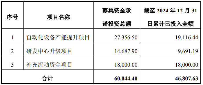 截至2024年12月31日,自动化设备产能提升项目、研发中心升级项目累计已投入金额分别为19116.44万元,9691.19万元,投资完成率分别为69.88%、65.98%。