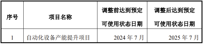 2024年4月24日,公司发布《关于部分募投项目延期的公告》。将自动化设备产能提升项目预定可使用状态日期从2024年7月调整到2025年7月。