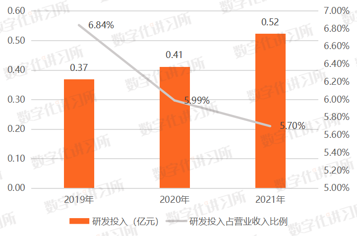 2019年至2021年,公司研发投入分别为0.37亿元、0.41亿元、0.52亿元,占总营收比例呈下降趋势,分别为6.84%、5.99%、5.70%,主要原因为营收增长。其中,公司研发费用主要为职工薪酬,分别为0.37亿元、0.41亿元、0.52亿元,分别占当期研发费用的99.91%、99.95%、99.71%。公司所处行业为人才密集型行业,2019年至2021年,公司职工薪酬分别占主营业务总成本的81.23%、82.28%、89.04%,与同行业可比公司成本结构无明显差异。