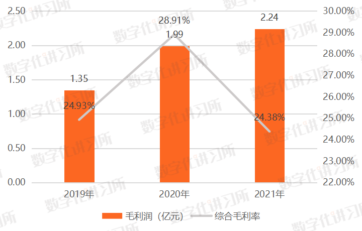 2019年至2021年,慧博云通毛利润分别为1.35亿元、1.99亿元、2.24亿元,同比增长72.13%、47.60%、12.60%,增速有所放缓;综合毛利率分别为24.93%、28.91%、24.38%,主要原因为2020年国家实施社保减免政策,公司人力成本有所减少,2021年社保减免政策退出,且由于中美贸易摩擦,公司对华为海思收入减少。