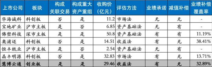 在慧博云通所列举的六个案例当中,只有华海诚科收购衡所华威既无业绩承诺也无减值补偿,宝地矿业和恒丰纸业均设置了减值补偿。佛塑科技和晶丰明源设置了业绩承诺,但覆盖率比慧博云通更低。