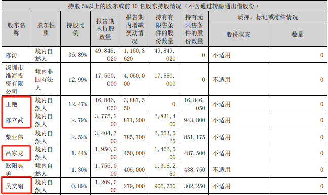 维海德2024年年度报告显示,王艳、陈立武、吕家龙、吴文娟分别为公司第三大股东、第四大股东、第六大股东、第八大股东。