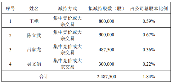 上述股东拟通过集中竞价或大宗交易方式减持股份数量合计2,487,500股,占公司目前总股本的1.84%。