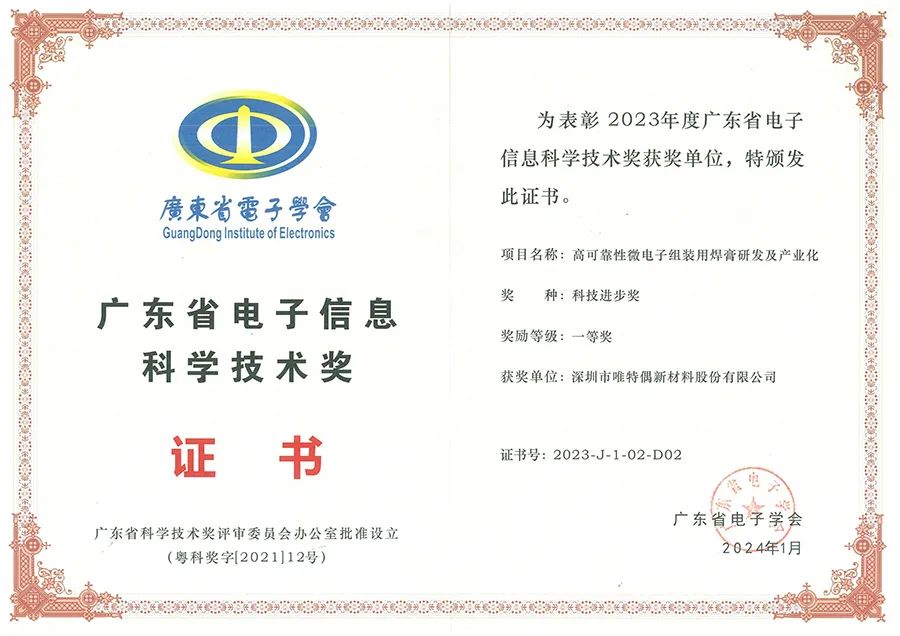近日,广东省电子学会颁发了2023年度广东省电子信息科学技术奖,凭借“高可靠性微电子组装用焊膏研发及产业化”项目,唯特偶及其董事长廖高兵先生,分别荣获科技进步奖一等奖!