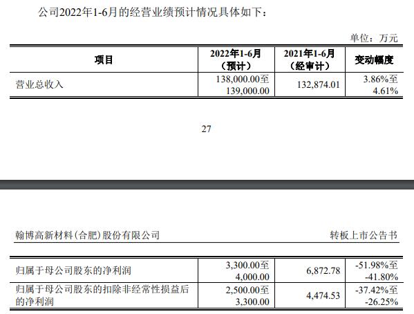 翰博高新表示,上述2022年1-6月业绩情况为公司初步预计数据,未经申报会计师审计或审阅,亦不构成公司的盈利预测或业绩承诺。