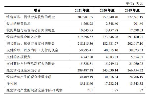 2019年、2020年、2021年,翰博高新主营业务收入分别为228,859.67万元、235,599.49万元、276,574.01万元;销售商品、提供劳务收到的现金分别为272,561.19万元、257,840.40万元、307,981.65万元。