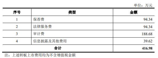 翰博高新转板上市费用合计416.98万元,其中中信建投证券股份有限公司获得保荐费94.34万元。