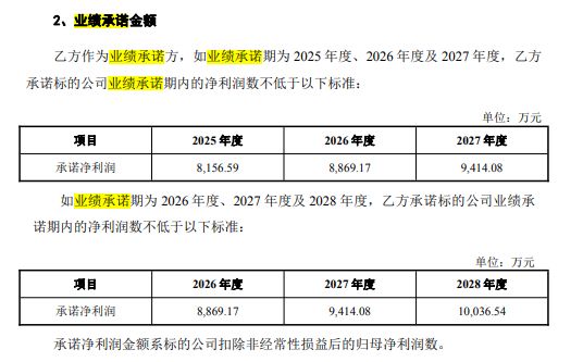 通过简单计算可以发现,这一承诺所对应的利润增速出现了下滑。基于2024年8146.16万元的扣非后净利润基数,2025年的承诺利润8156.59万元几乎与上一年持平,增长率微乎其微。而2026年和2027年的承诺净利润,相较于前一年的承诺值,其年增长率分别仅为8.74%和6.14%。