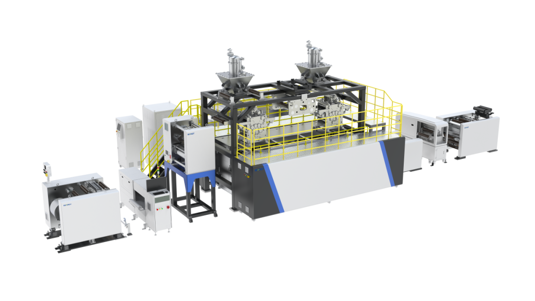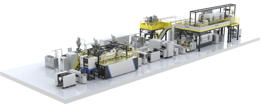 对于成膜压延设备,小试线中试线可以选用单面成膜复合设备,中试线和量产线可以选用双面成膜复合设备。双面成膜复合一体机一体化设计使得复合过程更加紧凑、高效,提高了生产效率,精确的张力测量和调节机构确保了复合过程中的张力稳定,避免了膜片变形或起皱的问题,自动收卷机构能够准确地将复合好的膜片卷成合适大小的极片膜卷,降低了操作难度和人工误差。