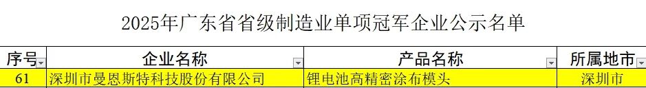 近日,广东省工业和信息化厅公布了2025年省级制造业单项冠军企业复核结果,曼恩斯特凭借在高端装备制造领域的持续深耕与技术突破,顺利通过复核,蝉联此项荣誉。