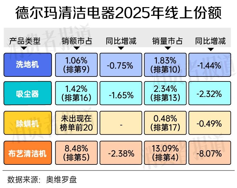 然而,据奥维罗盘数据,2025年,德尔玛的主要品类洗地机、吸尘器、除螨机、布艺清洁机在线上销售额市占和线上销量市占上均出现明显下滑。除了布艺清洁机外,其余品类的销额市占均在1.5%以下。