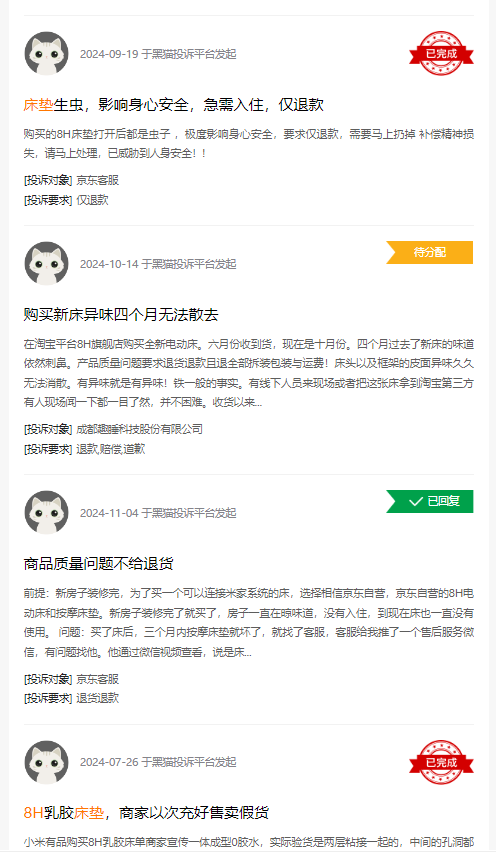 不算多苛求。以拳头产品“8H”为例,浏览黑猫投诉出现多起质量问题投诉,涉及床垫异味、生虫等质疑。