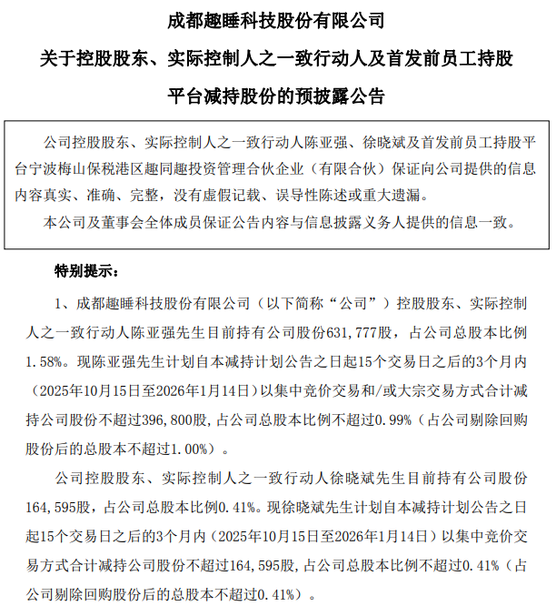 9月16日,趣睡科技发布了股东减持公告。公司控股股东、实际控制人之一致行动人陈亚强先生目前持有公司股份631,777股,占公司总股本比例1.58%。现陈亚强先生计划公告之日起15个交易日之后的3个月内(2025年10月15日至2026年1月14日)以集中竞价交易或大宗交易方式合计减持公司股份不超过396,800股,占公司总股本比例不超过0.99%。