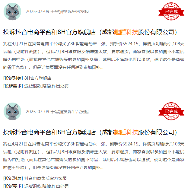 在网络投诉平台上,涉及趣睡科技的投诉也不少。在黑猫投诉平台上,关于趣睡科技的投诉显示有54条,主要涉及床垫有异味、服务不到位、产品维修难、沙发弹簧质量问题等情况。