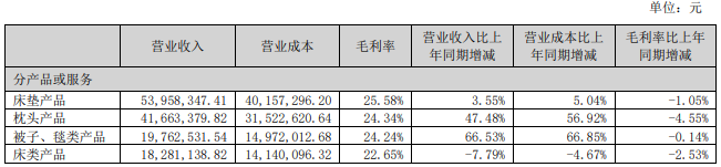 另外,公司主要依靠线上销售,线下销售渠道的占比非常少。今年上半年,公司主要产品床垫产品、枕头产品、被子毯类产品的营收虽然都出现了增长,但是营业成本的增长速度超过营收增速。而毛利率方面,这些主要产品都出现了不同程度的下滑。