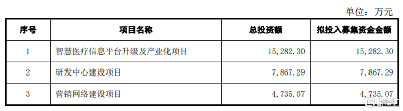 本次IPO拟募资3.19亿元,主要用于智慧医疗信息平台升级及产业化项目、研发中心建设项目、营销网络建设项目、补充流动资金。