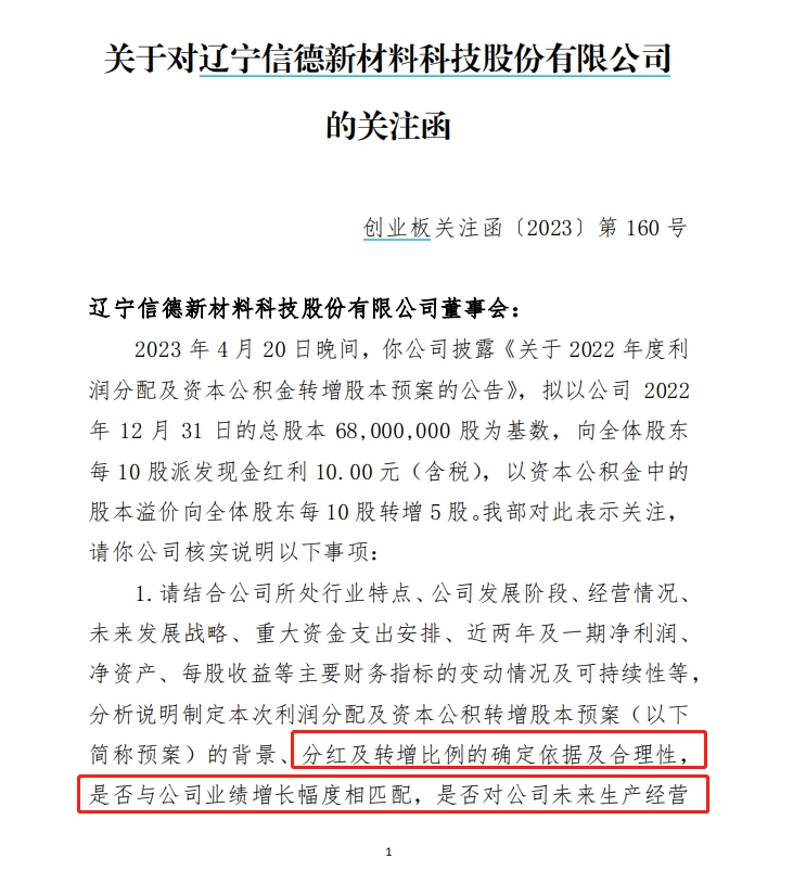 对此,关注函要求信德新材结合公司所处行业特点、公司发展阶段、经营情况、未来发展战略、重大资金支出安排、近两年及一期净利润、净资产、每股收益等主要财务指标的变动情况及可持续性等,分析说明制定本次利润分配及资本公积转增股本预案(以下简称预案)的背景、分红及转增比例的确定依据及合理性,是否与公司业绩增长幅度相匹配,是否对公司未来生产经营产生不利影响,是否存在炒作股价情形,并充分提示相关风险。