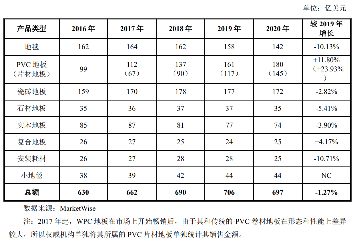 Market Wise相关数据显示,全球地板市场规模近年来稳定在700亿美元左右,而PVC地板市场在全球地板市场中的份额处于持续上升的阶段,2020年其全球销售金额较上一年增长了23.93%,大幅领先其他品类的地板产品,对其他地板产品市场形成挤压。