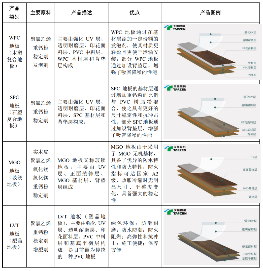 具体来看,公司产品主要包括木塑复合地板(WPC地板)、石塑复合地板(SPC地板)、玻镁地板(MGO地板)、塑晶地板(LVT地板)等,具有绿色环保、防火阻燃、脚感舒适、性能稳定、可回收利用等特点。