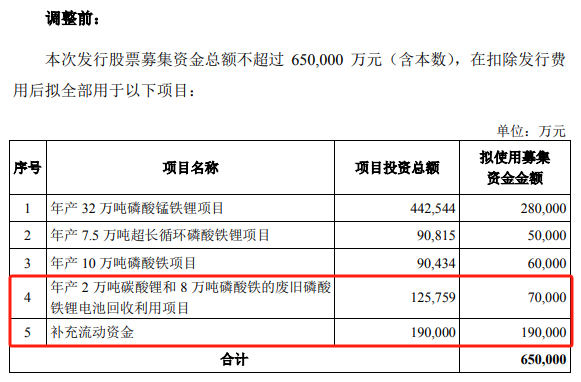 湖南裕能此次调整的定增预案中,取消募投“年产2万吨碳酸锂和8万吨磷酸铁的废旧磷酸铁锂电池回收利用项目”,并把补充流动资金的金额由19亿元减少到9亿元。