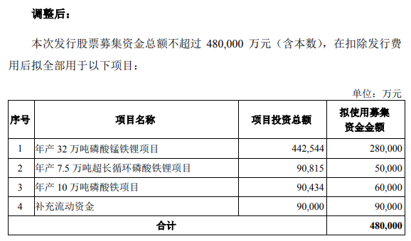 不过,年产32万吨磷酸锰铁锂项目、年产7.5万吨超长循环磷酸铁锂项目、年产10万吨磷酸铁项目募投金额未变。也就是说,磷酸铁锂及其上游产品仍旧是湖南裕能本次募资的“重头戏”。