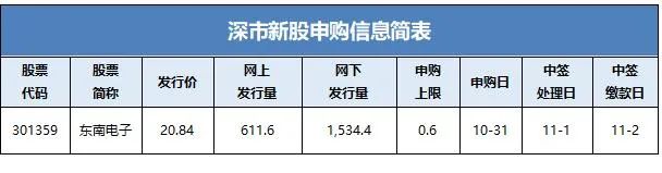 2022年10月31日,东南电子股份有限公司(简称:东南电子)将通过深交所网下发行电子平台和交易系统发行新股,具体信息如下。