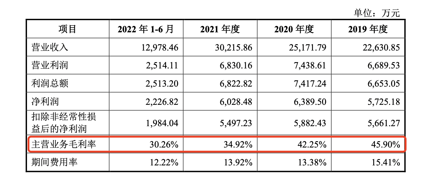 值得注意的是,报告期内,公司主营业务毛利率分别为 45.9%、42.25%、34.92%,呈逐年下降趋势,主要原因系原材料价格上涨、客户需求变化以及新厂房投入使用引起的折旧增加所致。
