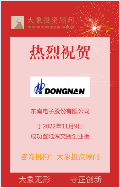 2022年11月9日,大象投顾客户——东南电子股份有限公司成功登陆深交所创业板。
