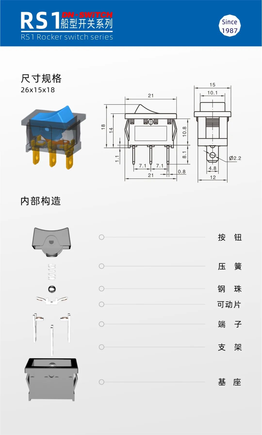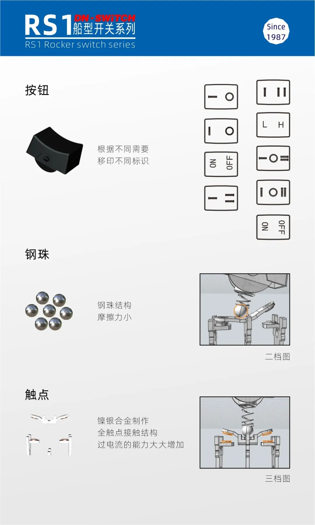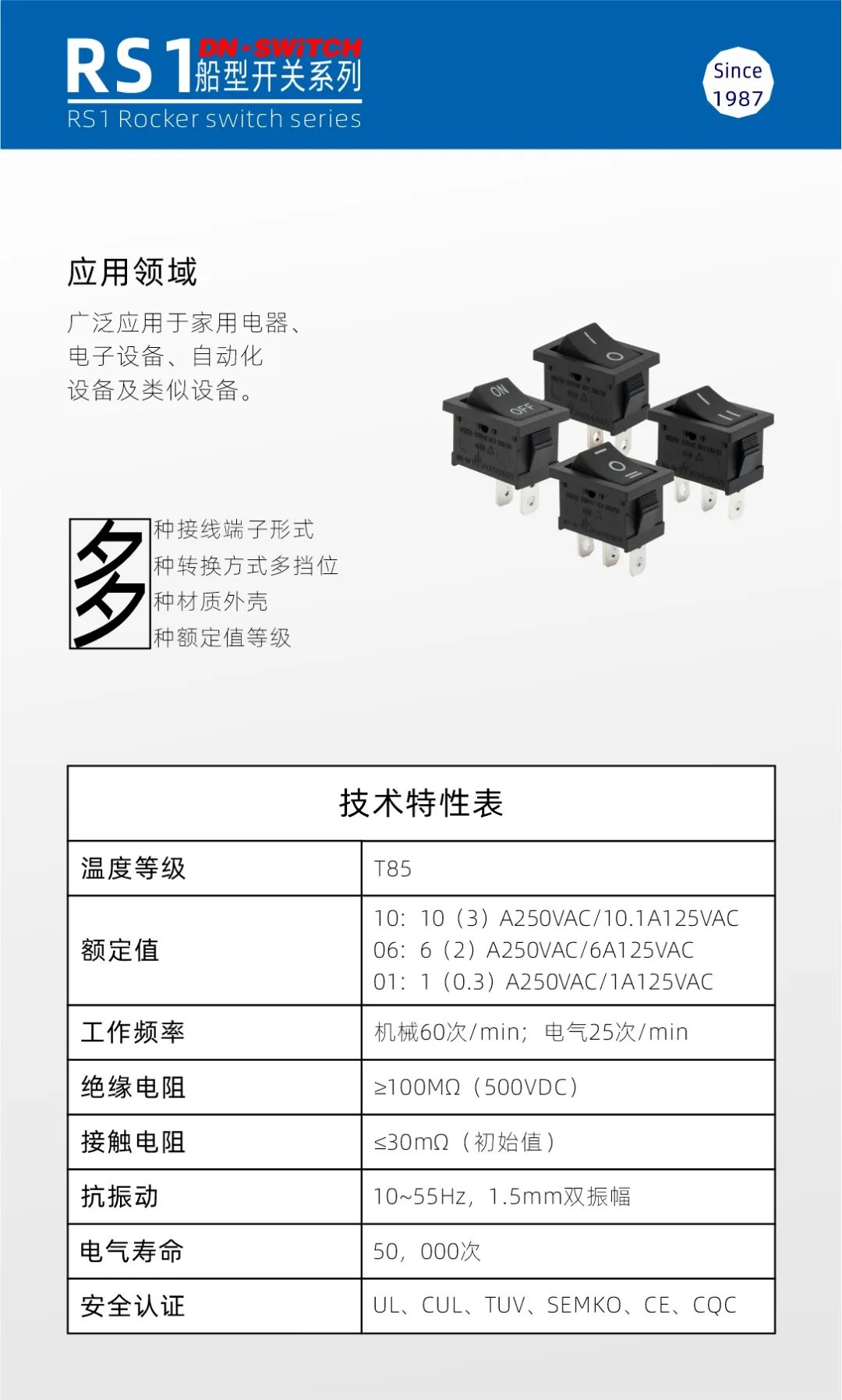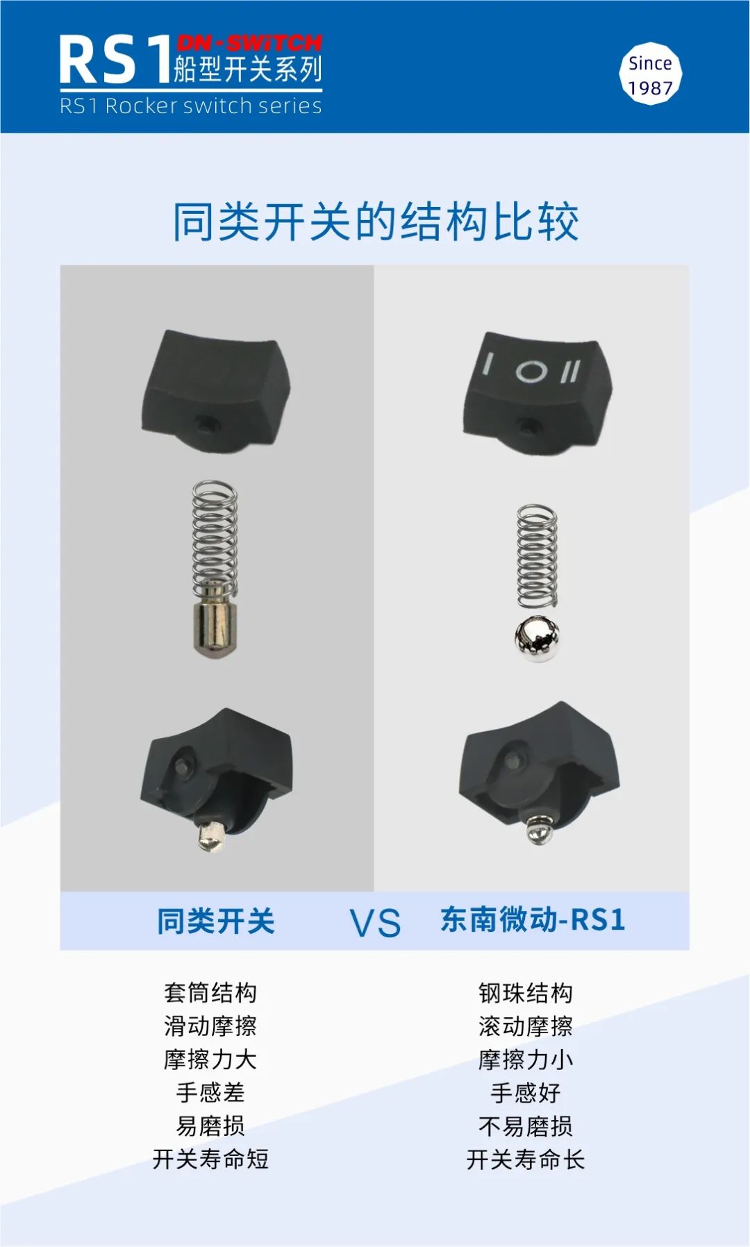 东南电子RS1型船型开关简单可靠,安全如一,采用钢珠结构,360度自由转动,摩擦力小,手感好,可快速过死点,大幅提高使用寿命,且配备多种外壳和按钮,端子种类多样(可定制)。适用于家用电器、电子设备、自动化设备及类似设备等。