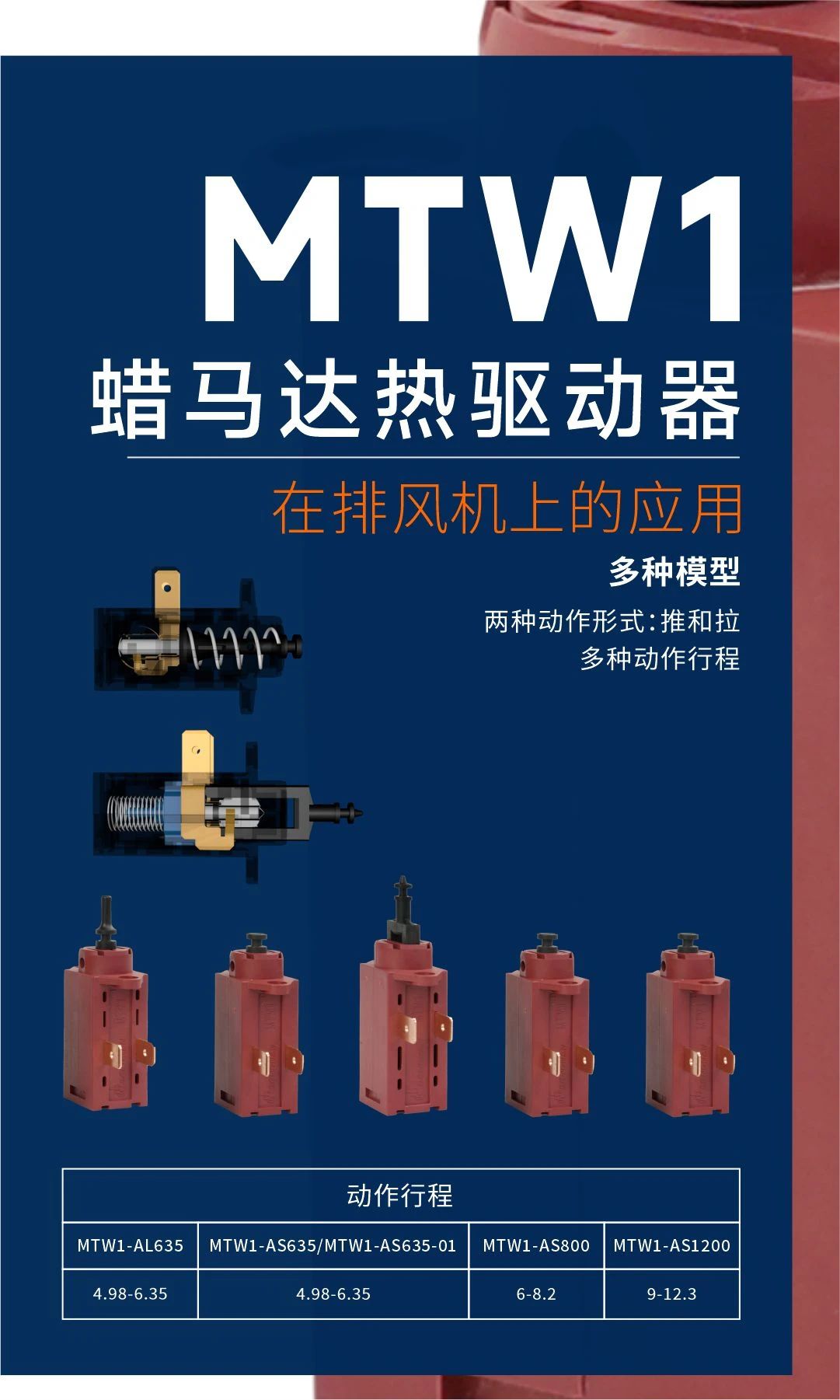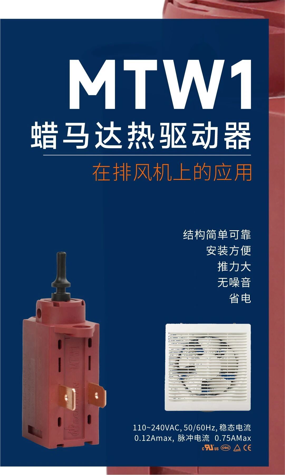 东南电子研发的MTW1蜡马达热驱动器可应用于排风机的控制——通过蜡熔化和凝固实现风机的开启和关闭。蜡马达热驱动器结构简单,安装方便,推力大,无噪音,还省电。