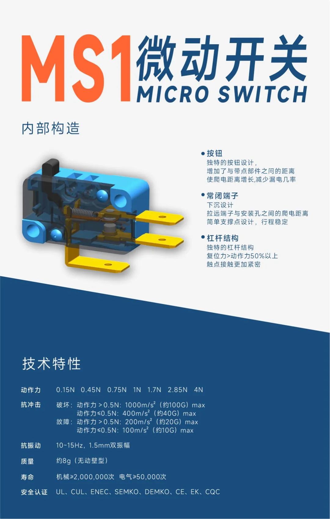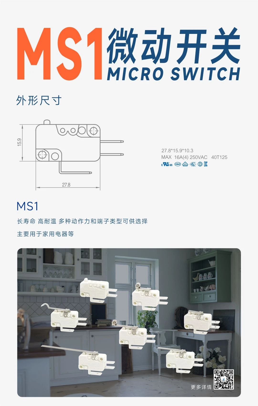 东南电子MS1型微动开关,多种动作力,长寿命,高耐温,独特的按钮设计,增加了与带电阻部件之间的距离,使爬电距离增长,减少漏电几率。可用于洗碗机、洗衣机等家用电器。东南电子为您提供专业的微动开关解决方案。