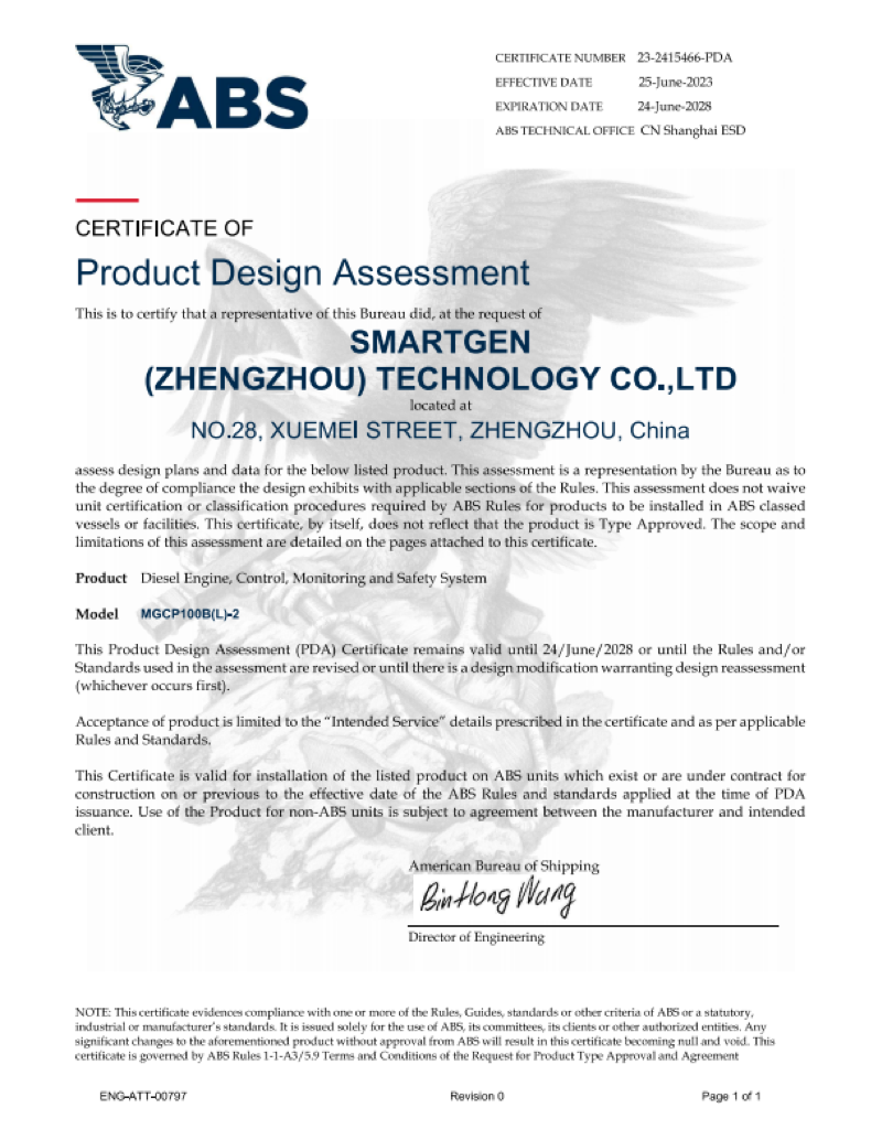 热烈庆贺众智科技船机产品获得美国ABS船机认证并取得ABS证书,与此同时,船用机旁控制柜MGCP100B(L)-2也获得了ABS的认可,并且众智科技船用柴油机控制器和模块类产品拥有了5年内免检销售的资质。