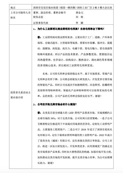 (1)拓展品类:公司研发部会根据市场需求持续开发引领市场前沿的新品类,立足商业照明和工业照明两大板块,加大智能产品的开发力度。同时,公司也会持续推动LED照明技术与农业、安全、城市、体育、医美照明等深度融合,加快植物照明、应急照明、美容照明、体育照明等领域的发展,稳步提升公司的经营业绩。