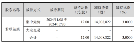 2024年11月8日至2024年12月20日,君联益康通过集中竞价方式合计减持公司股份14,008,822股,占公司剔除回购股份后总股本的3.0000%,减持均价为12.00元/股。经计算,君联益康本次套现1.68亿元。