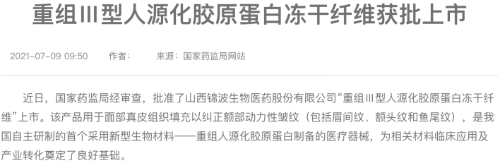 然而,记者注意到,敷尔佳在这一领域的布局已稍显落后。在重组Ⅲ型人源化胶原蛋白贴敷料方面,目前市场上已有悦丝汀、舒奈美、创福康等多个品牌的同类产品在售。更具代表性的是,锦波生物早在2021年就已有“重组Ⅲ型人源化胶原蛋白冻干纤维”获批上市,其两款胶原蛋白填充剂产品也已获得国家药监局批准。在成分创新加速、技术窗口期不断缩短的背景下,敷尔佳能否凭借后续研发实现弯道超车,仍需市场检验。