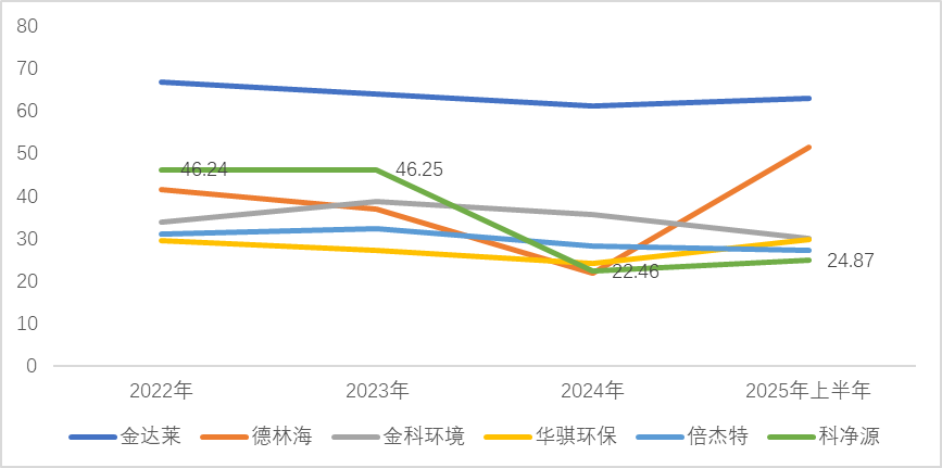 2024年,公司的净利润直接由盈转亏,在当年亏损了1.31亿元。与同行业可比公司金达莱、德林海、金科环境、华骐环保、倍杰特相比,公司利润表现已是垫底的存在。