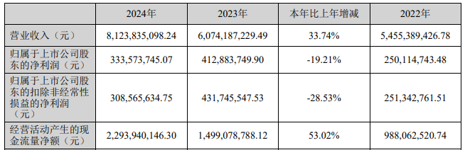 2024年,公司营业收入81.24亿元,同比增长33.74%;归属于上市公司股东的净利润3.34亿元,同比减少19.21%;归属于上市公司股东的扣除非经常性损益的净利润3.09亿元,同比减少28.53%;经营活动产生的现金流量净额22.94亿元,同比增长53.02%。